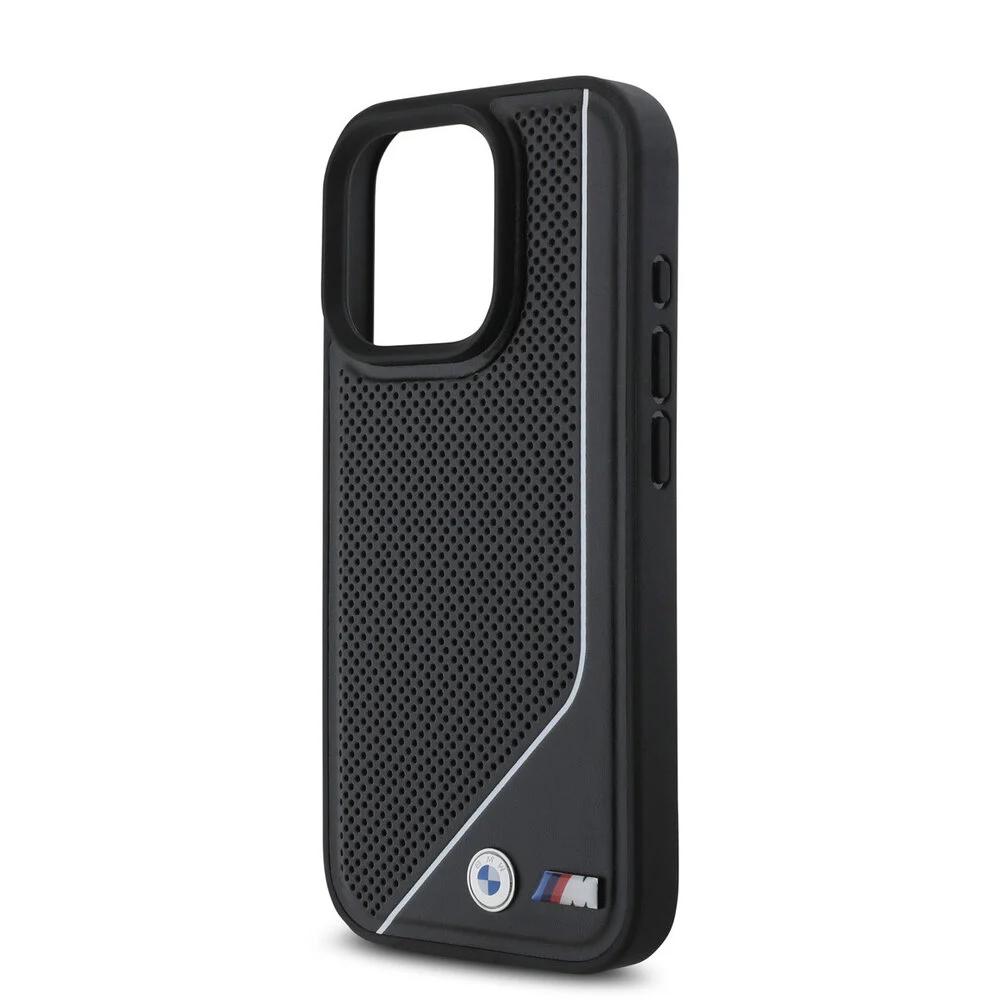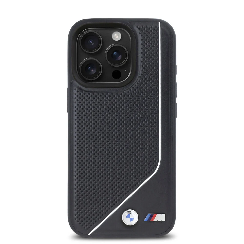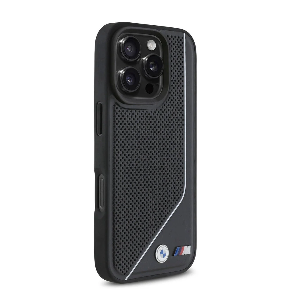 De BMW iPhone 16 Pro Max Back cover case combineert stijl en functionaliteit in één strakke, zwarte behuizing. Het geperforeerde paneel met een diagonale witte lijn en het M-logo geven deze case een sportieve uitstraling, terwijl robuuste randen en verhoogde camerabescherming je toestel optimaal beschermen.