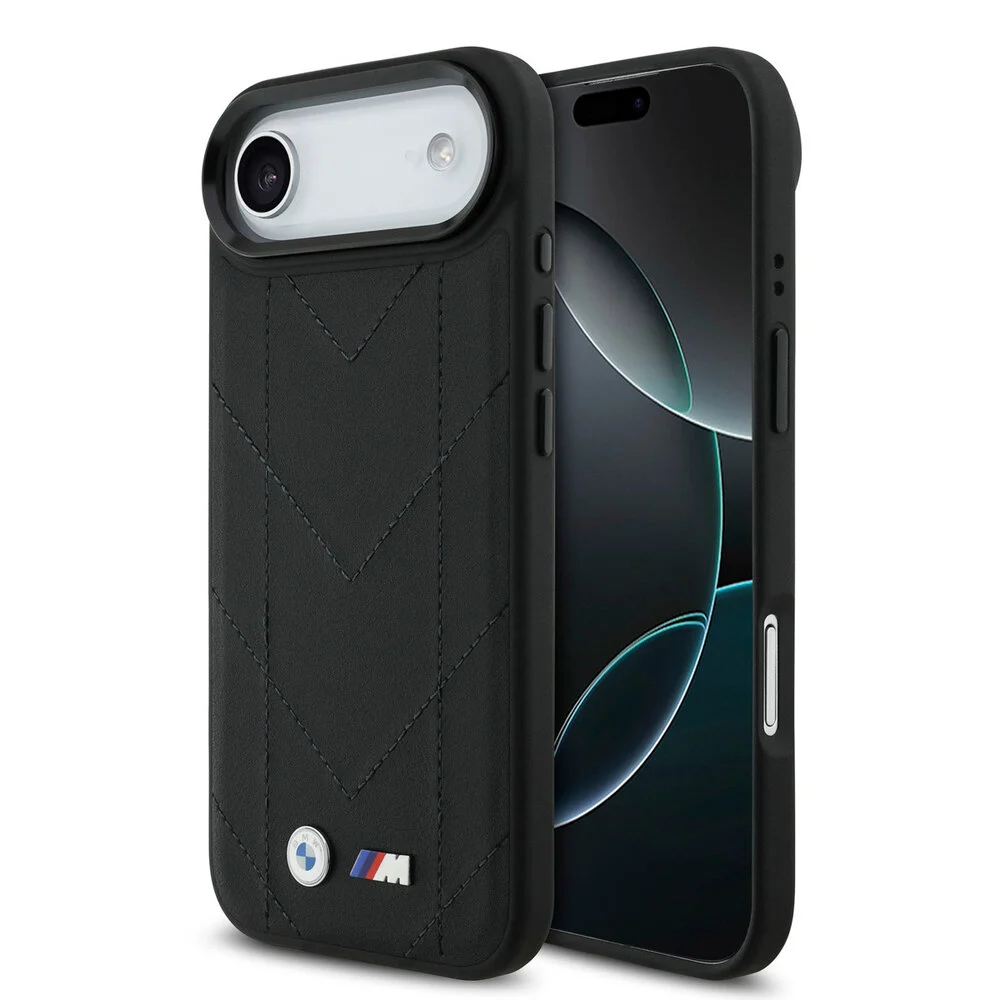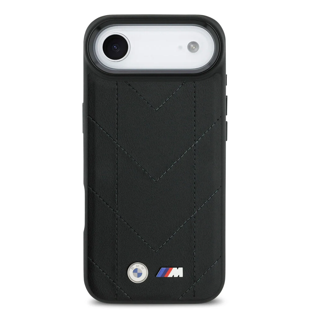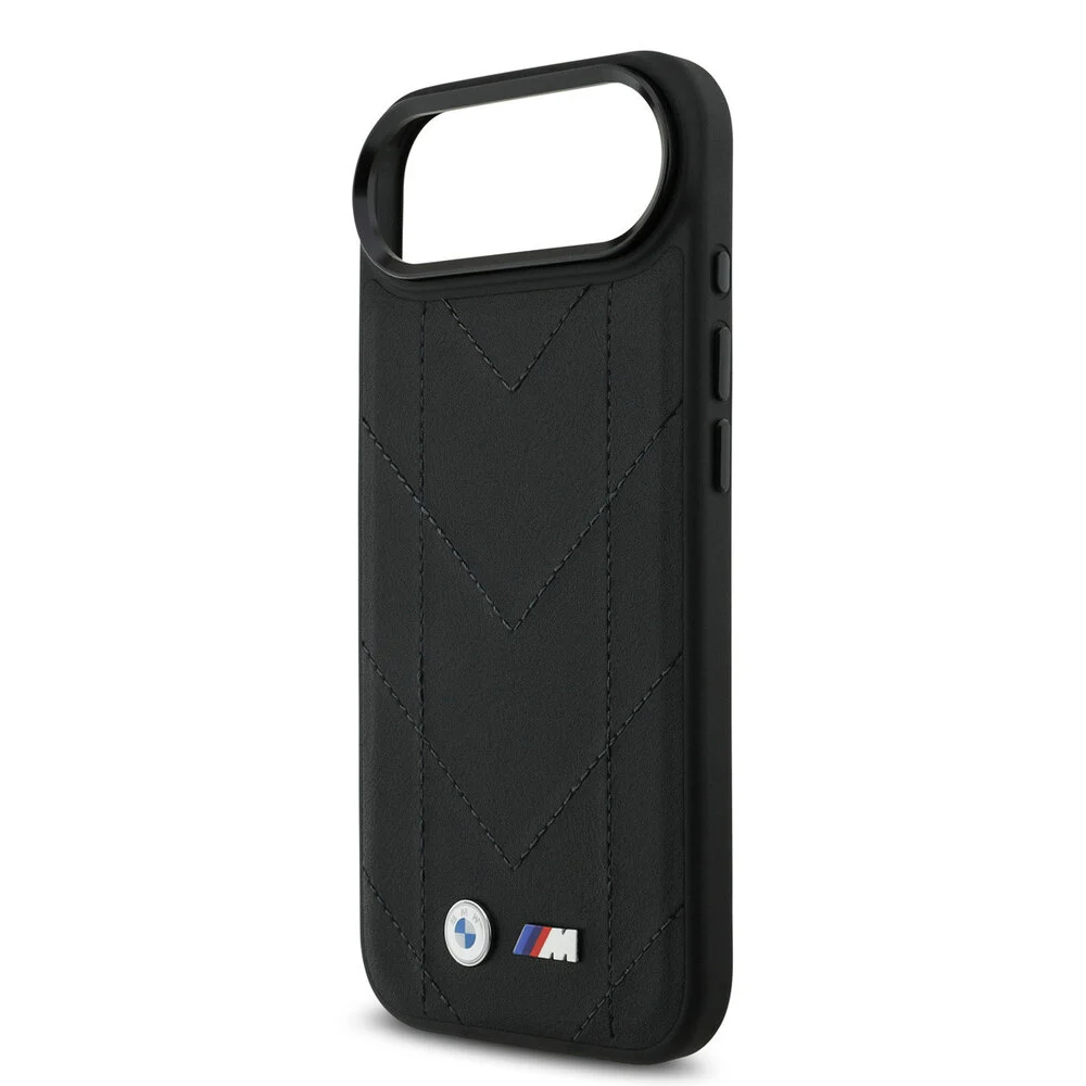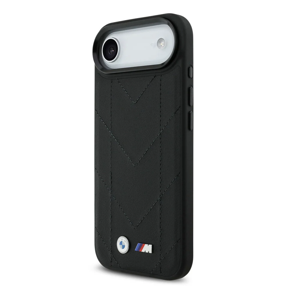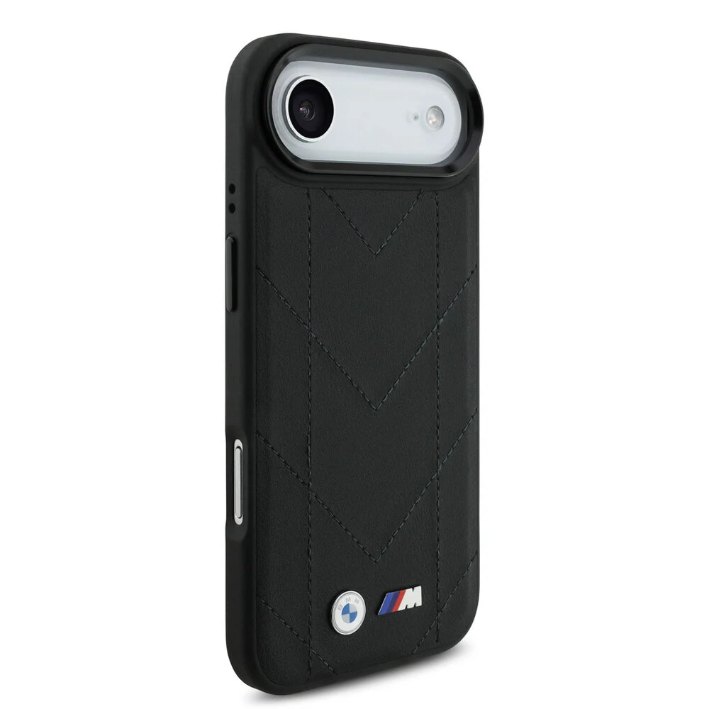 Deze zwarte back cover, vervaardigd uit gewatteerd leer, beschikt over een uniek chevronstiksels ontwerp en heeft een metalen BMW M-logo dat de premium uitstraling benadrukt. Deze slanke case is volledig compatible met MagSafe, waardoor het eenvoudig is om gebruik te maken van magnetische accessoires. De verhoogde randen bieden extra bescherming voor het camera- en scherm, wat de duurzaamheid van de case verder versterkt. Bovendien zorgen precieze knoppenuitsparingen ervoor dat de functionaliteit van de iPhone 17 Air behouden blijft.