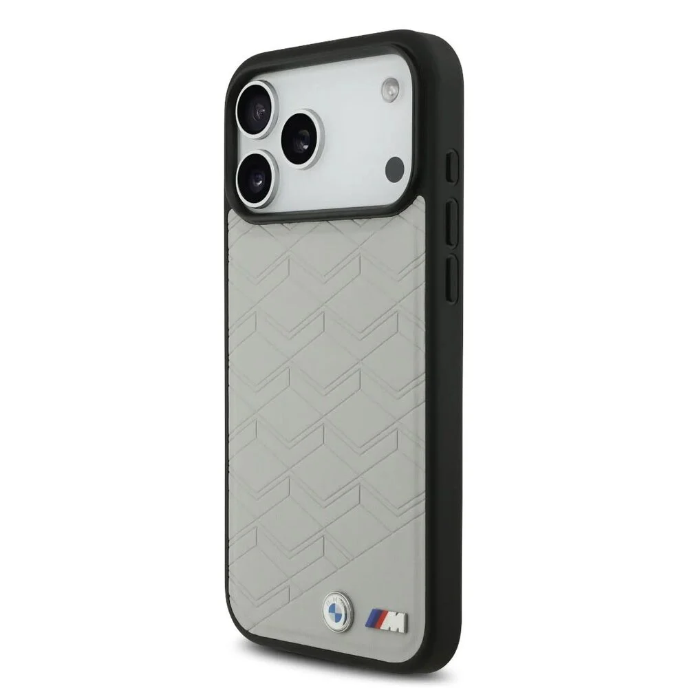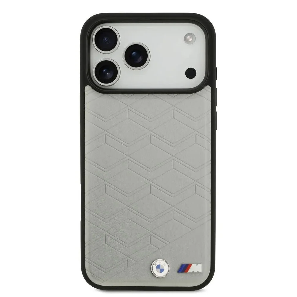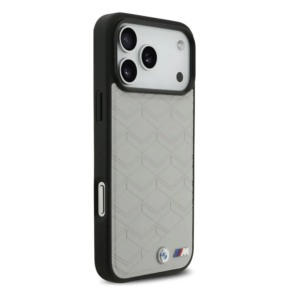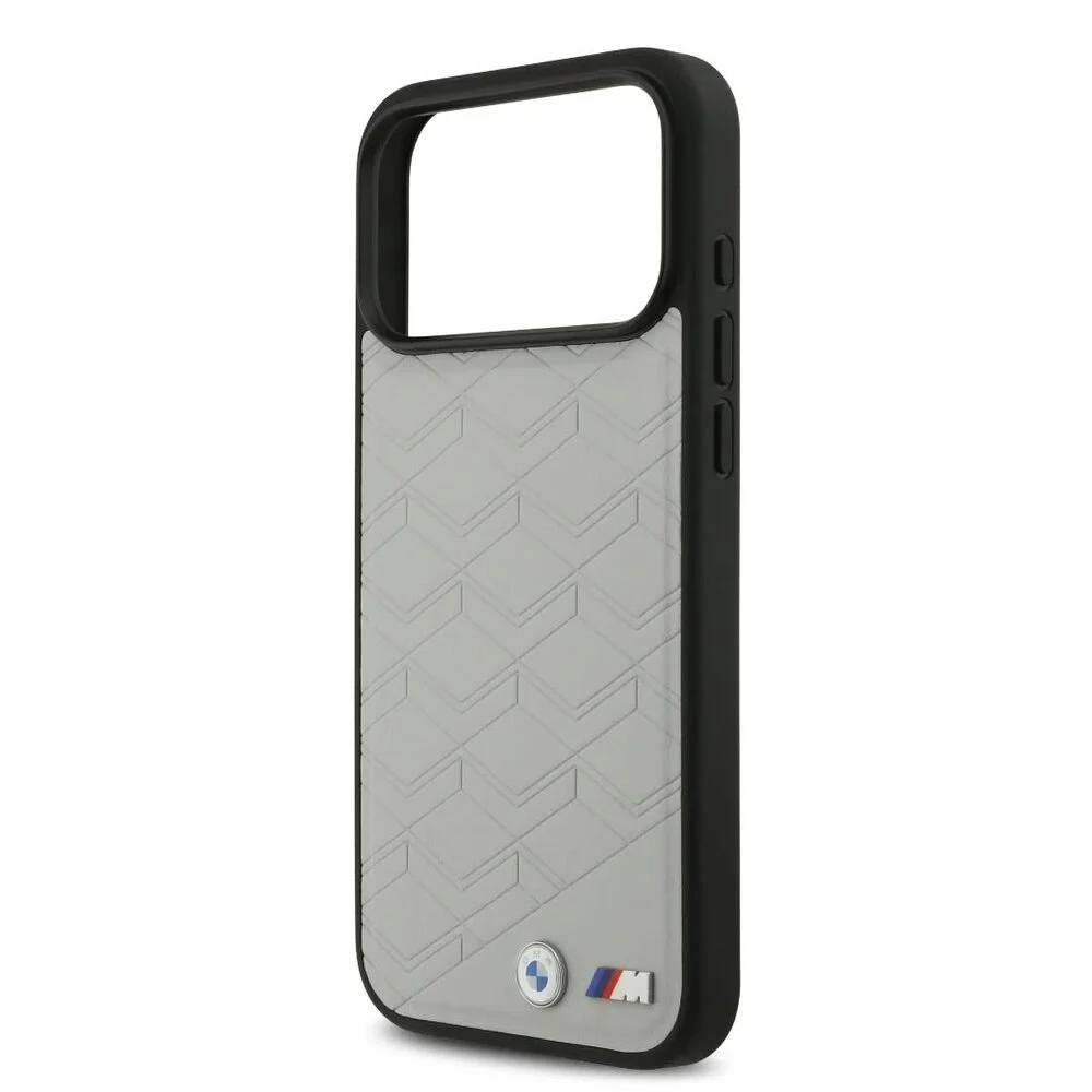 Deze back cover case is vervaardigd van hoogwaardig leer in een verfijnde grijze kleur met chevronreliëf, wat niet alleen een luxe uitstraling geeft, maar ook een stevige grip biedt. De zwarte bumper verhoogt de randen voor extra bescherming, terwijl de precieze uitsparingen zorgen voor een perfecte pasvorm en gebruiksgemak. De metalen emblemen accentueren de premium look, waardoor deze case zowel stijlvol als functioneel is.