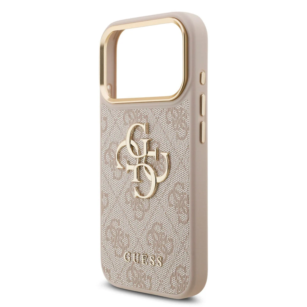 Het Guess iPhone 17 Pro Backcover hoesje biedt een perfecte mix van stijl en functionaliteit. Dit stijlvolle hoesje in een roze-beige 4G-textuur, met een opvallend groot metalen logo en een goudkleurige cameraring, maakt een sterke indruk in elke setting.