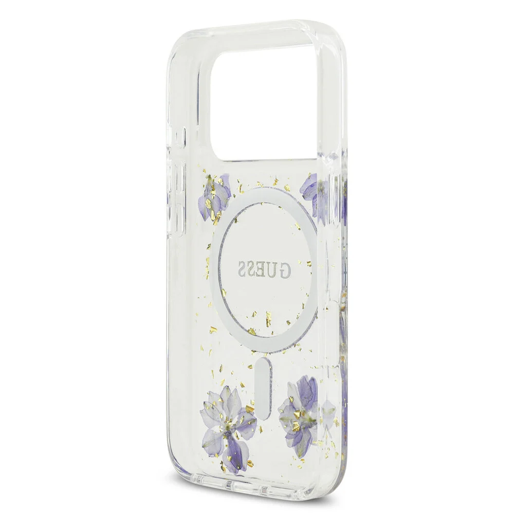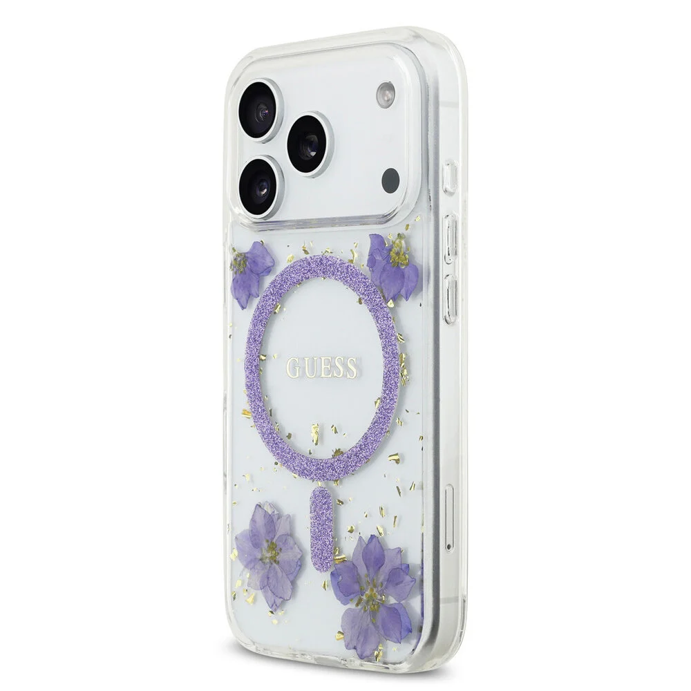 Deze elegante back cover voor de iPhone 17 Pro verbindt stijl met functionaliteit. Het doorzichtige дизайн van Guess, met zijn paarse glitter en een delicate combinatie van gedroogde bloemen en goudvlokjes, maakt dit hoesje een opmerkelijke keuze voor de modebewuste gebruiker.