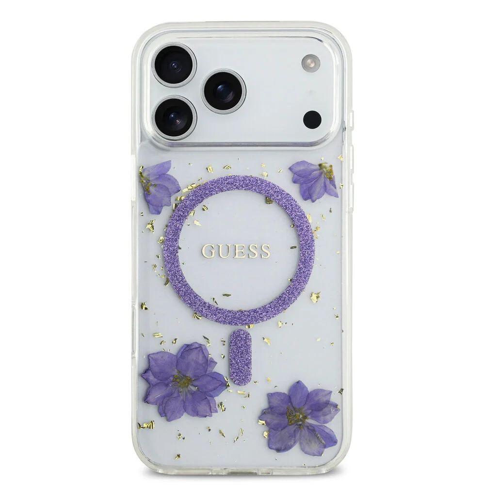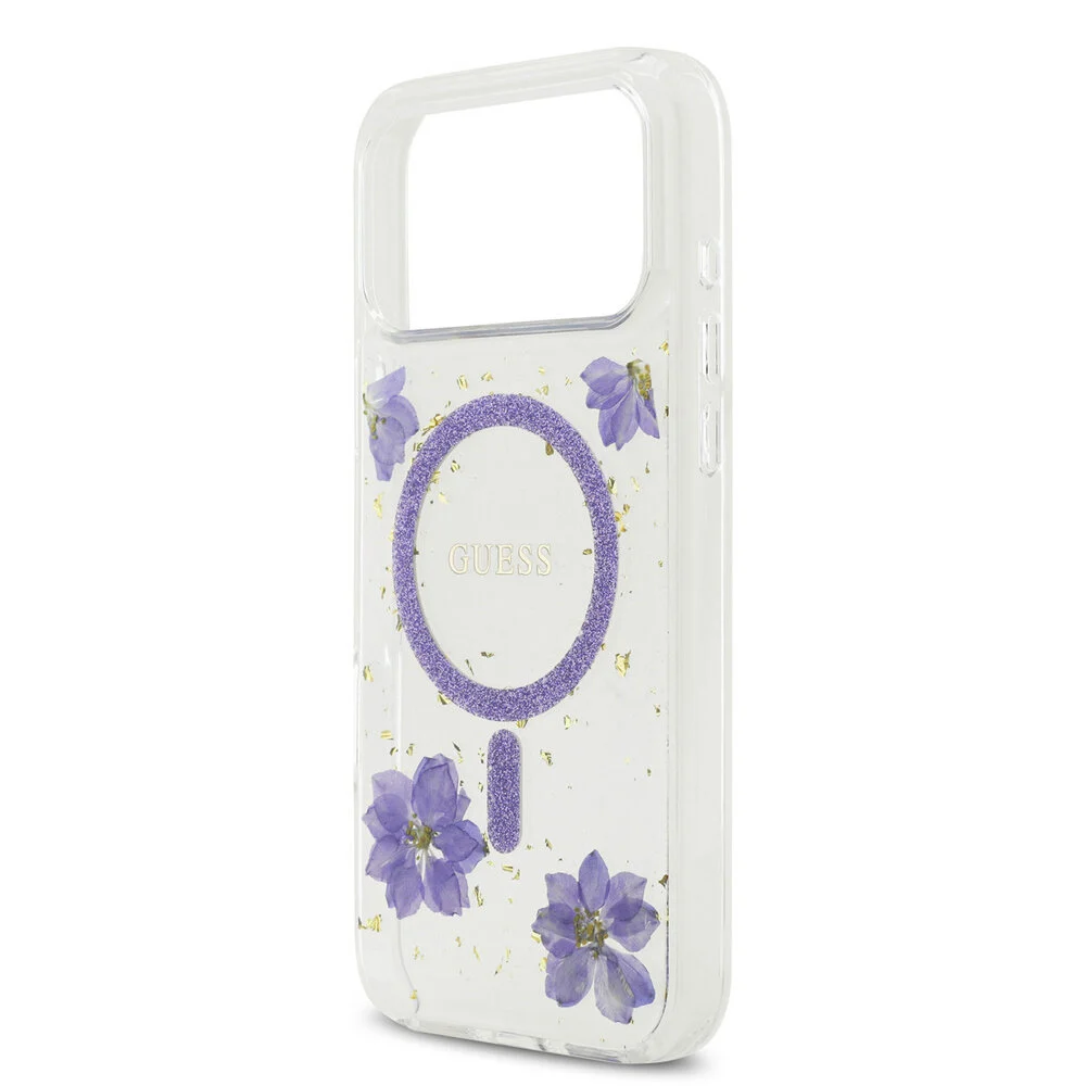 De Guess Magsafe – Resin Flowers Design back cover voor de iPhone 17 Pro Max is een perfecte combinatie van stijl en functionaliteit. Deze transparante smartphonecase in paars met delicate bloemen en gouden vlokken voegt een luxe touch toe aan de smartphone terwijl hij tegelijkertijd bescherming biedt.