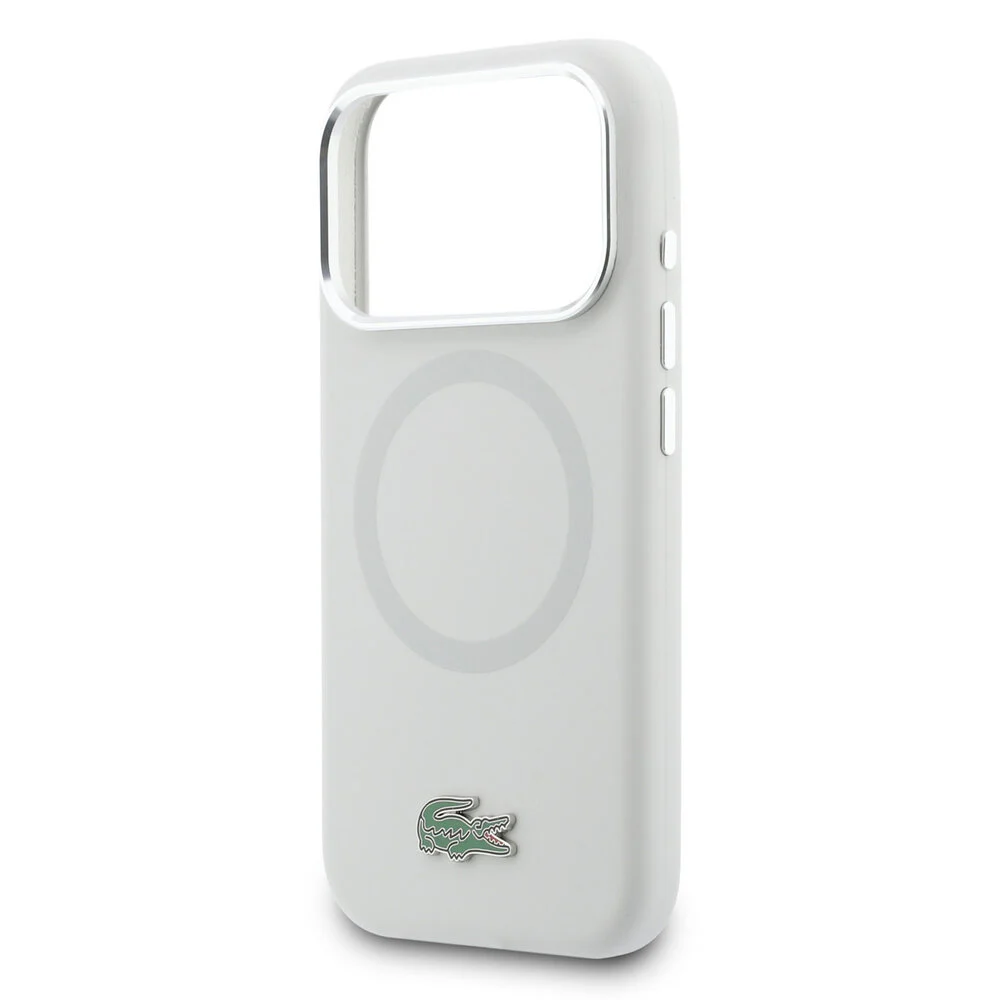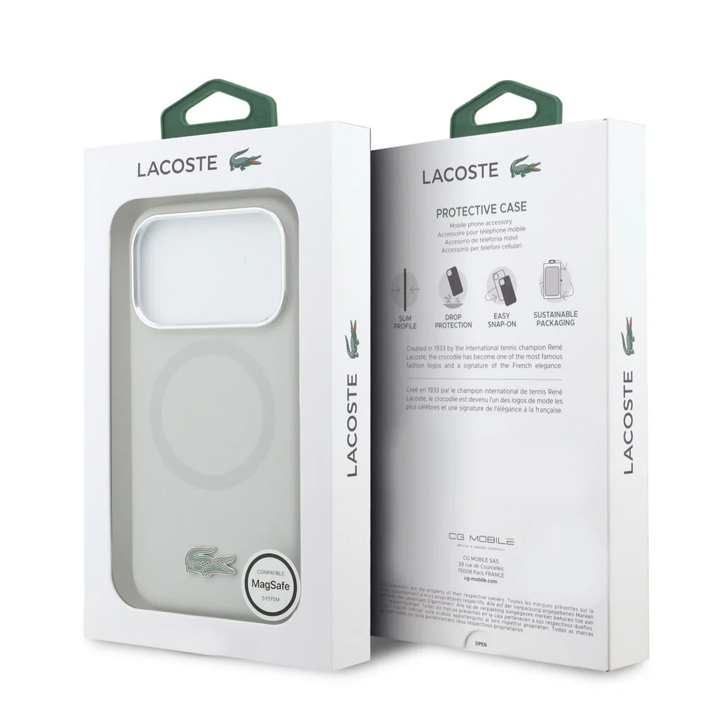 Dit hoesje beschermt je toestel terwijl het een stijlvolle uitstraling behoudt. Dankzij MagSafe laad je snel op zonder het hoesje te verwijderen. De metalen details en het iconische Lacoste-logo zorgen voor een luxe gevoel dat opvalt.