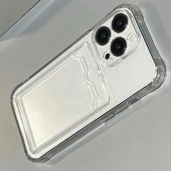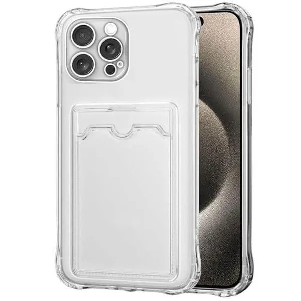 Beschrijving van een transparant siliconen hoesje voor de Apple iPhone15 Pro met een vakje voor één pasje